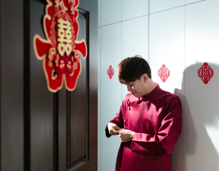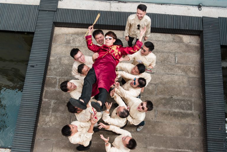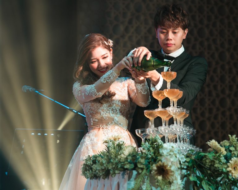 The grand march in is leaded by their 2-year-old son, he was driving a kid’s electrical remote car along the aisle, then Jorise enter the ballroom by holding Mac’s hand with a full crystal beaded Cathedral train gown.